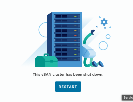 To restart the cluster, ensure all the hosts are booted. Leave them in maintenance mode and then select “Restart vSAN Services” The workflow will enable them to bring them back into operation.
