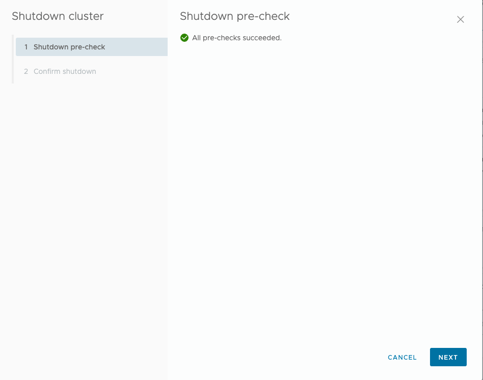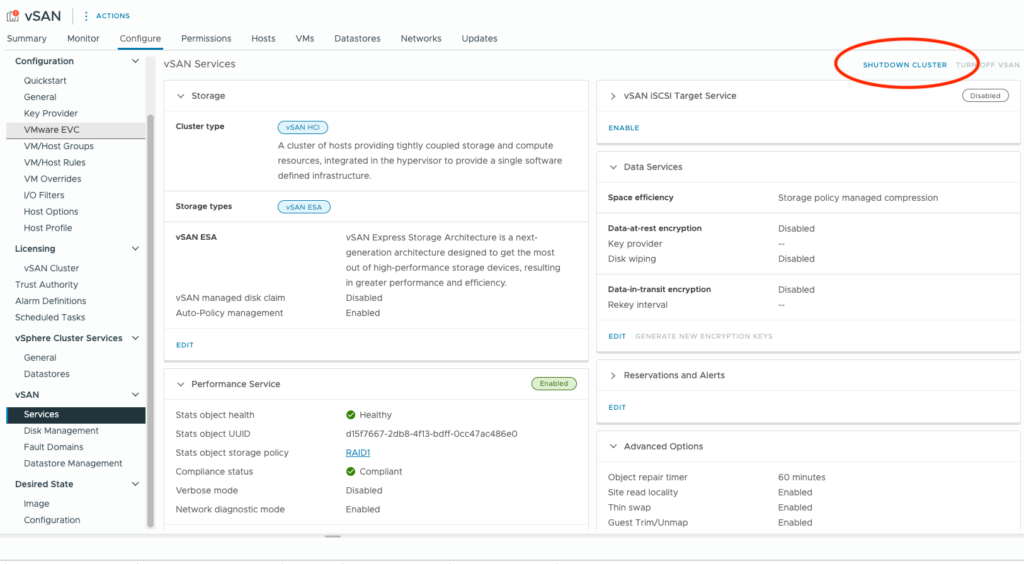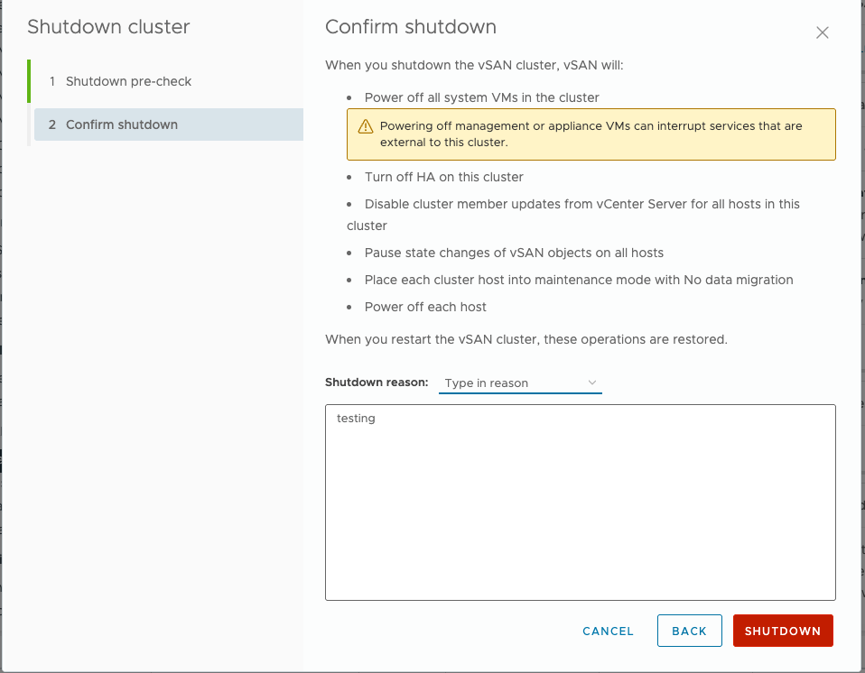 To shut down a vSAN cluste,r there is a nice workflow built into vCentre that will orchestrate all the required actions for you