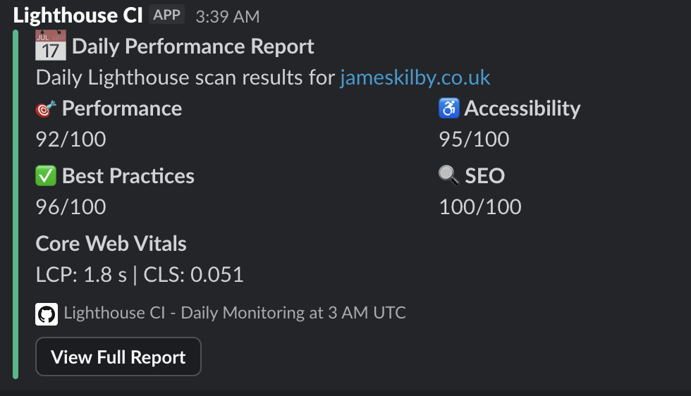 I decided to take this a step further. I have deployed a Github action that watches commits to the underlying repo. When anything changes in the public directory (i.e. the public facing website) the action is triggered. This action waits for 2 minutes for the public site to finish the deployment to Cloudflare Pages. It then runs the Google Lighthouse performance tests. Grabs the data and populates it in a few locations. This includes a slack message as shown below. It updates the stats page on the blog. Plus a full detailed report is available in Github. The full report is approximately 18MB and is available for 30 days.